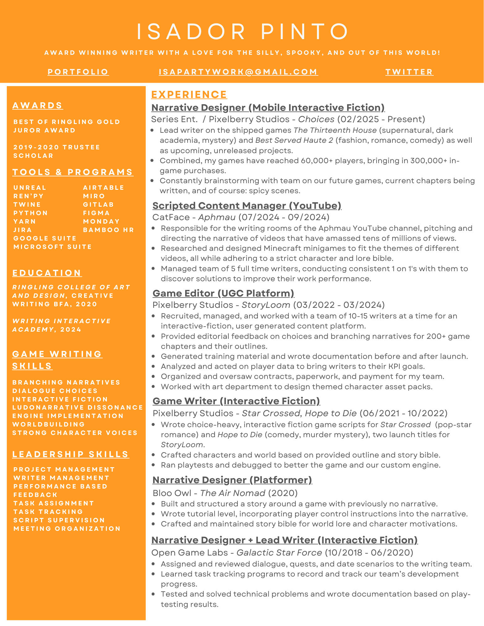 I'm a games and comics writer who believes life is-a party!The party started while I was attending Ringling College of Art + Design in 2017 and hasn't stopped since! I've written games for multiple studios including the Open Game Labs, Bloo Owl, Drowsy Drake, and Pixelberry. Since then I've dabbled in YouTube, content creation, and most recently as a writer for the hit mobile app Choices.I specialize in creating memorable, humorous, and occassionally horrific narratives and characters for video games and comics but love writing for film, TV, and prose as well.In my free time I enjoy doing improv comedy, petting chunky cats, and writing and recording pop music! I love working with others and would love the opportunity to work with you! Feel free to reach out if you have a question, want to work together, or would just like to say "hey! here's a cute pic of my cat."email: [email protected]